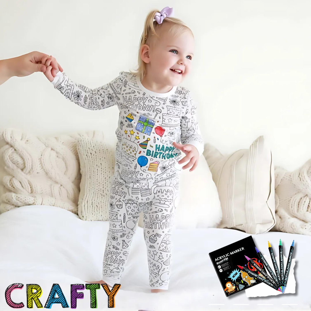 The perfect activity. Create your very own custom loungewear with these great soft cotton sets designed to be coloured in. Available in 6 different designs for both boys and girls. Use the free fabric pens to colour in the design!